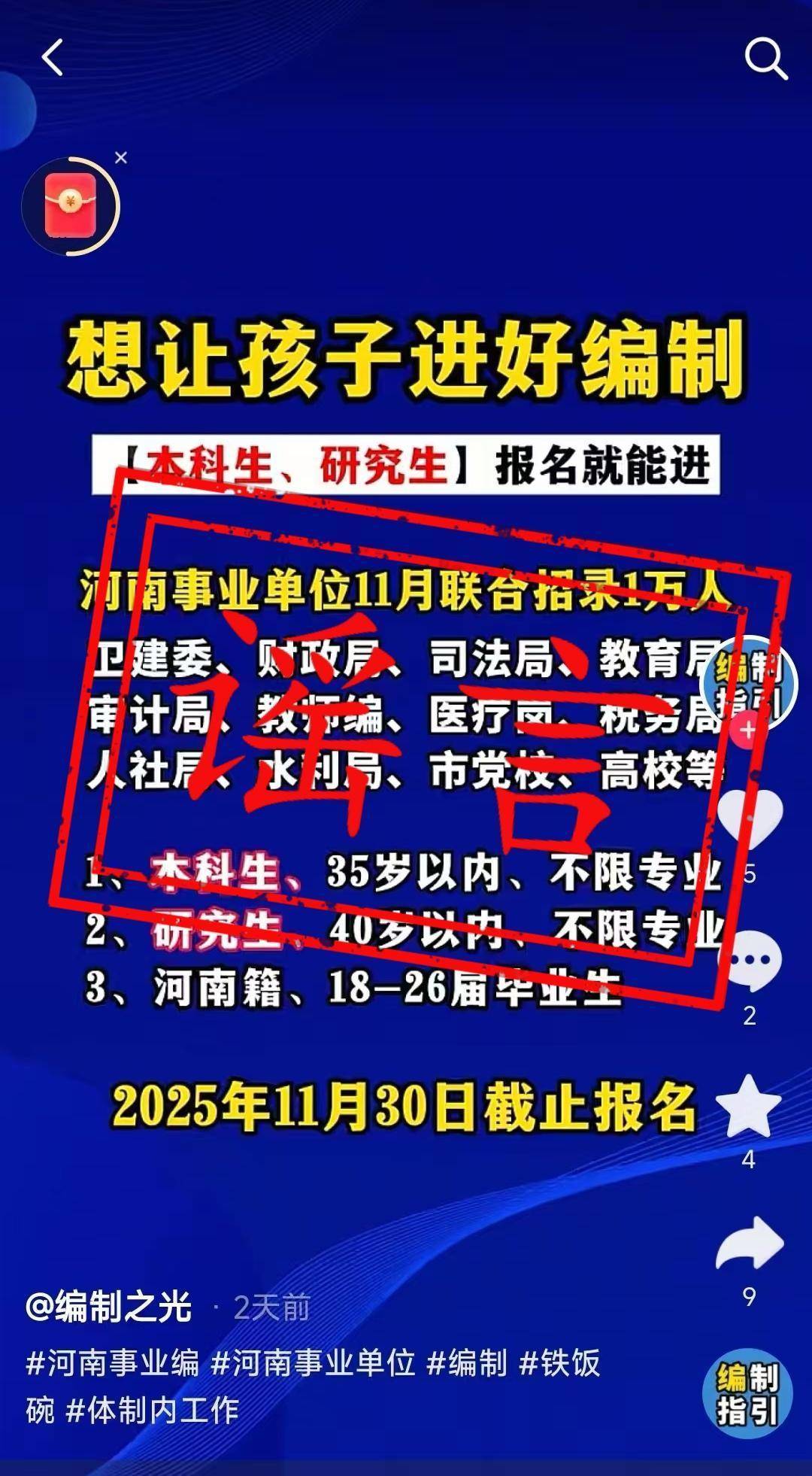 郑州某考验公司职工鞠某叶为诱导流量、获得功绩,使用编著软件拼接网罗素材,捏造发布“河南行状编招聘万东谈主,本科起报”等各类诞妄招聘信息累计300余条,酿成不良影响。经公安机关造访,鞠某叶对罪人作为供认不讳,公安机关已照章对其处以行政贬责。